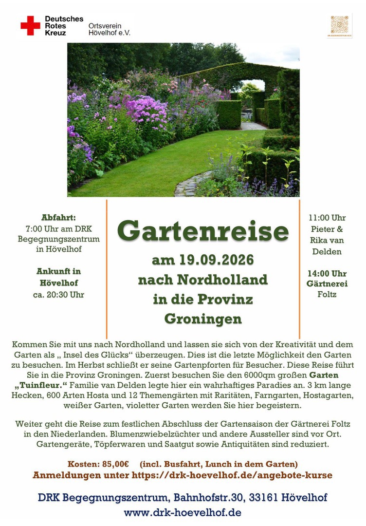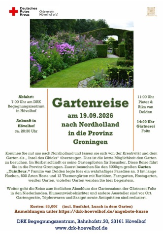 Frühlingsreise zum Garten Tuinfleur und Gärtneri Folz mit Internationalen Ausstellern in den Niederlanden und Garten Diddens in Leer. Anmeldung unter https://drk-hoevelhof.de/angebote-kurse 89€